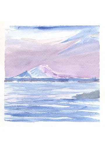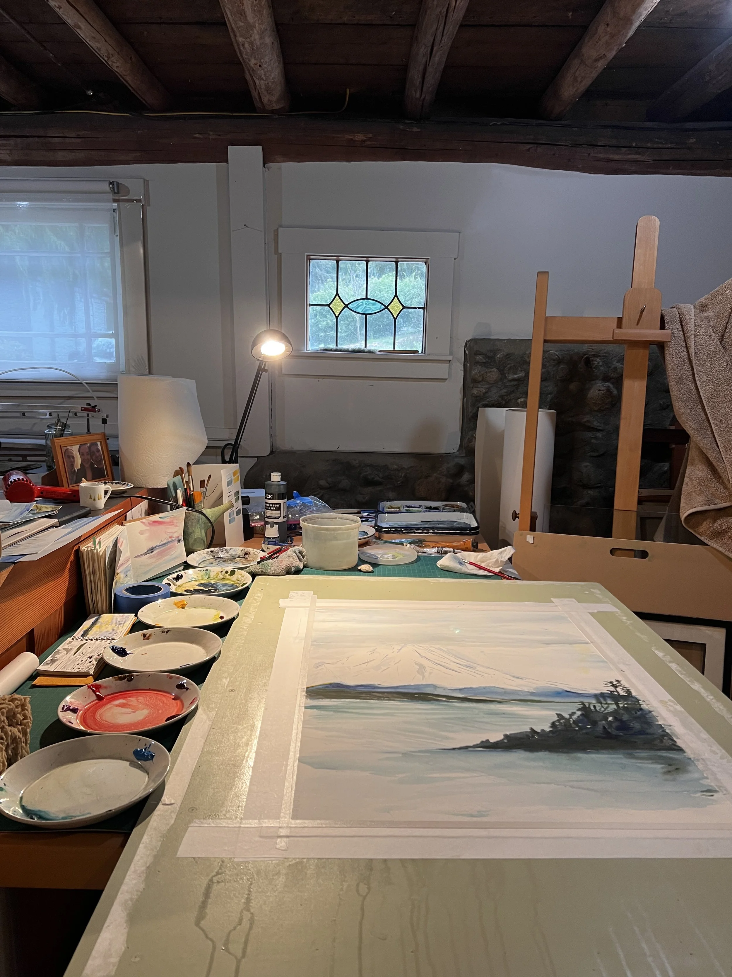 On the Puget Sound when the sky is clear, which is seldom in our rain shadow, locals exclaim “Rainier’s out!” I know I’m not the only artist to pass through this special part of the United States and become captivated with the ever changing panoramic mountain views. This is a series of watercolor studies done between January and April 2024 in preparation for the commissioned piece (shown below) that now lives on Bainbridge Island. The goal was to capture the special East facing view that the buyer’s had of Mt. Rainier. My process was a combination of on-site plein air studies to map out the layout and finished in studio. I learned how to stretch watercolor paper to wooden boards with paper tape for a professional finish.